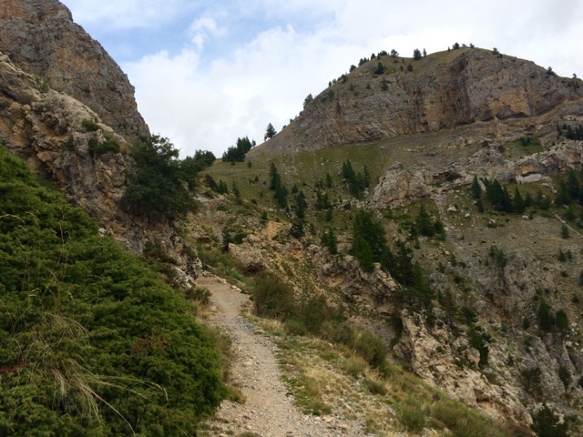 The Col de Crousette was the last great mountain pass on the GR5. There is rugged hiking after that pass, but the trail does not rise above 2000 meters again en route to Nice. The trail from Roya to the Col de Crousette was worthy of its special status. After a preliminary passage through a forest, the trail bursts into the open in a broad valley, beside a rushing stream. It climbs steadily into rocky terrain, passing around a looming cliff. Then, incongruously, the trail crosses a flat, peaceful meadow. The hiker catches his breath there, before tackling the final approach to the pass, a bleak landscape of rock and scree. In short, this trail has everything that a hiker could want.